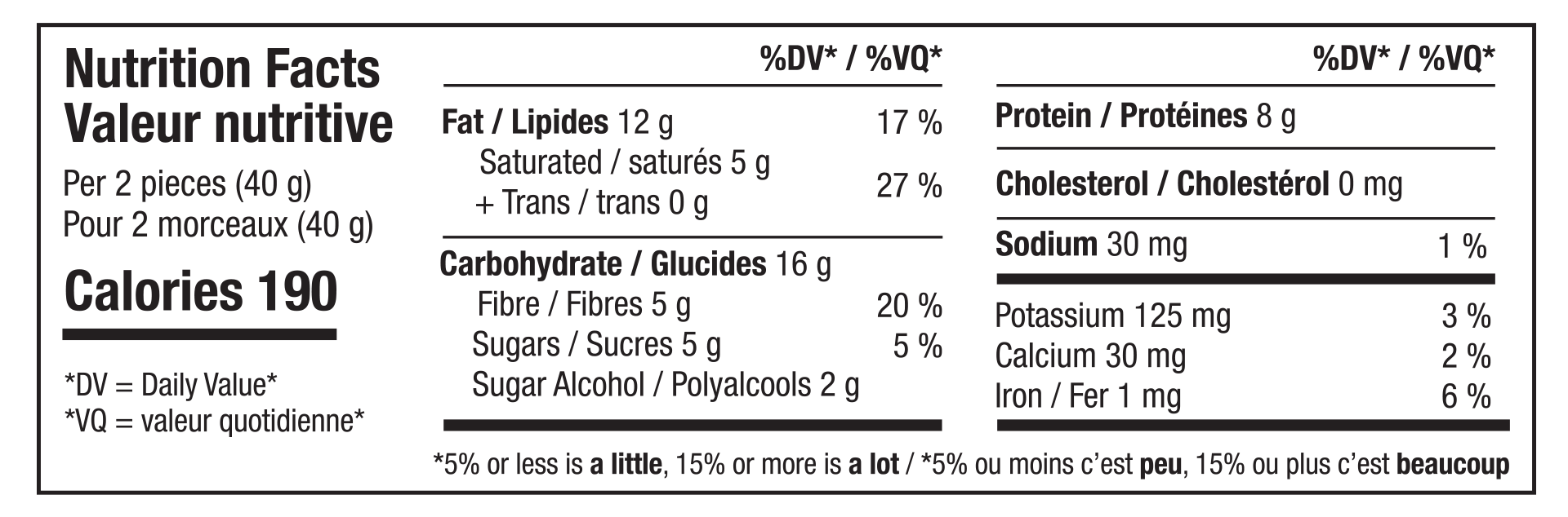 - Macros (per 40g / 2 pieces): 8g protein, 5g sugar, 5g fibre.
